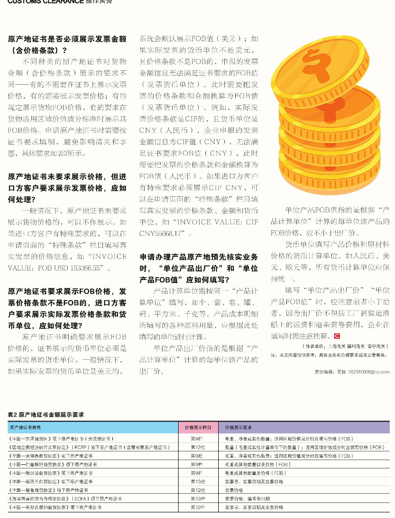 不同种类的原产地证书对货物金额(含价格条款)展示的要求不同——有的不需要在证书上展示发票价格,有的需要展示发票价格;有的规定展示货物FOB价格,有的要求在货物适用区域价值成分标准时展示其FOB价格。申请原产地证书时需要按证书要求填制,避免影响清关和享惠,具体要求如表2所示。