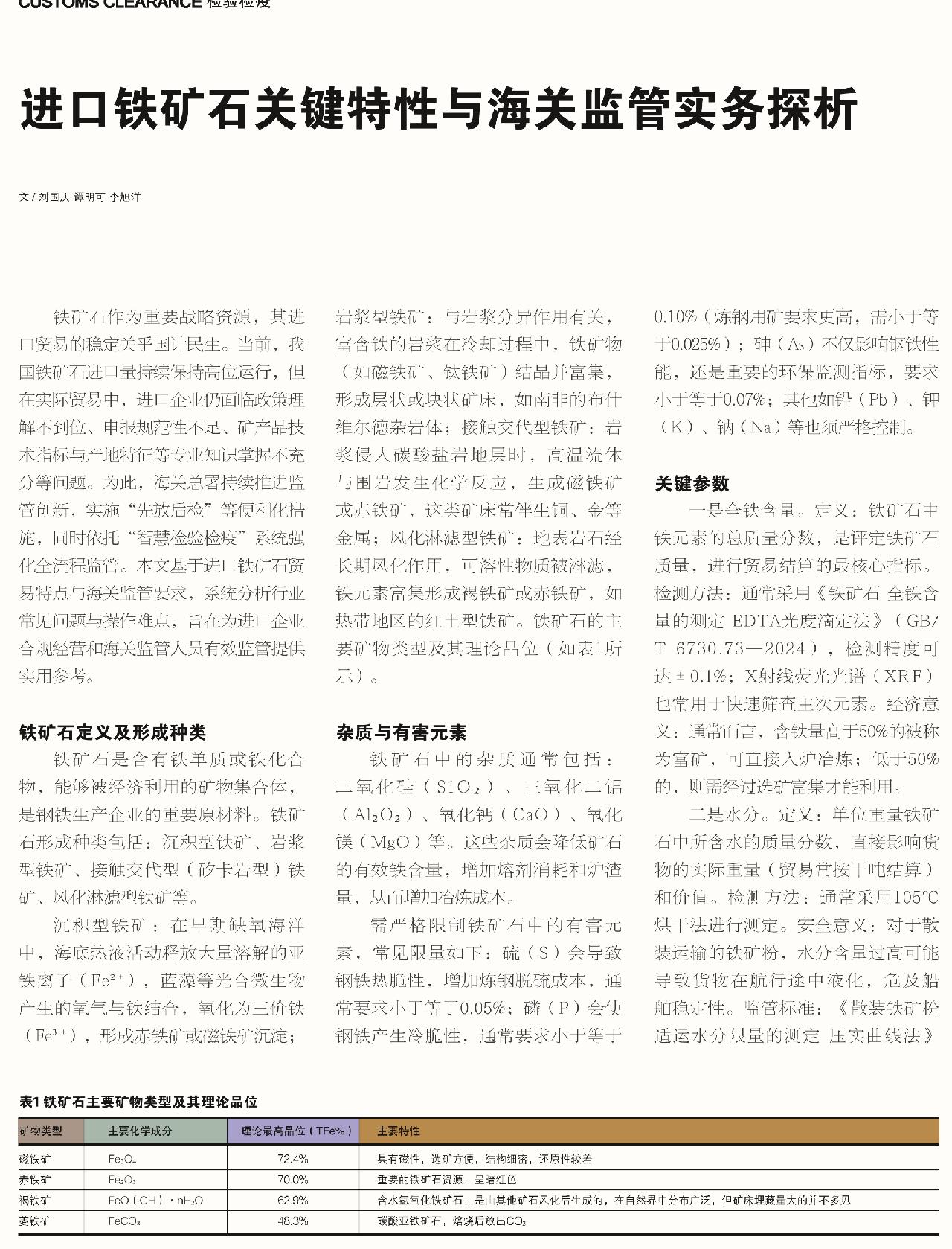 铁矿石作为重要战略资源,其进口贸易的稳定关乎国计民生。当前,我国铁矿石进口量持续保持高位运行,但在实际贸易中,进口企业仍面临政策理解不到位、申报规范性不足、矿产品技术指标与产地特征等专业知识掌握不充分等问题。为此,海关总署持续推进监管创新,实施“先放后检”等便利化措施,同时依托“智慧检验检疫”系统强化全流程监管。本文基于进口铁矿石贸易特点与海关监管要求,系统分析行业常见问题与操作难点,旨在为进口企业合规经营和海关监管人员有效监管提供实用参考。