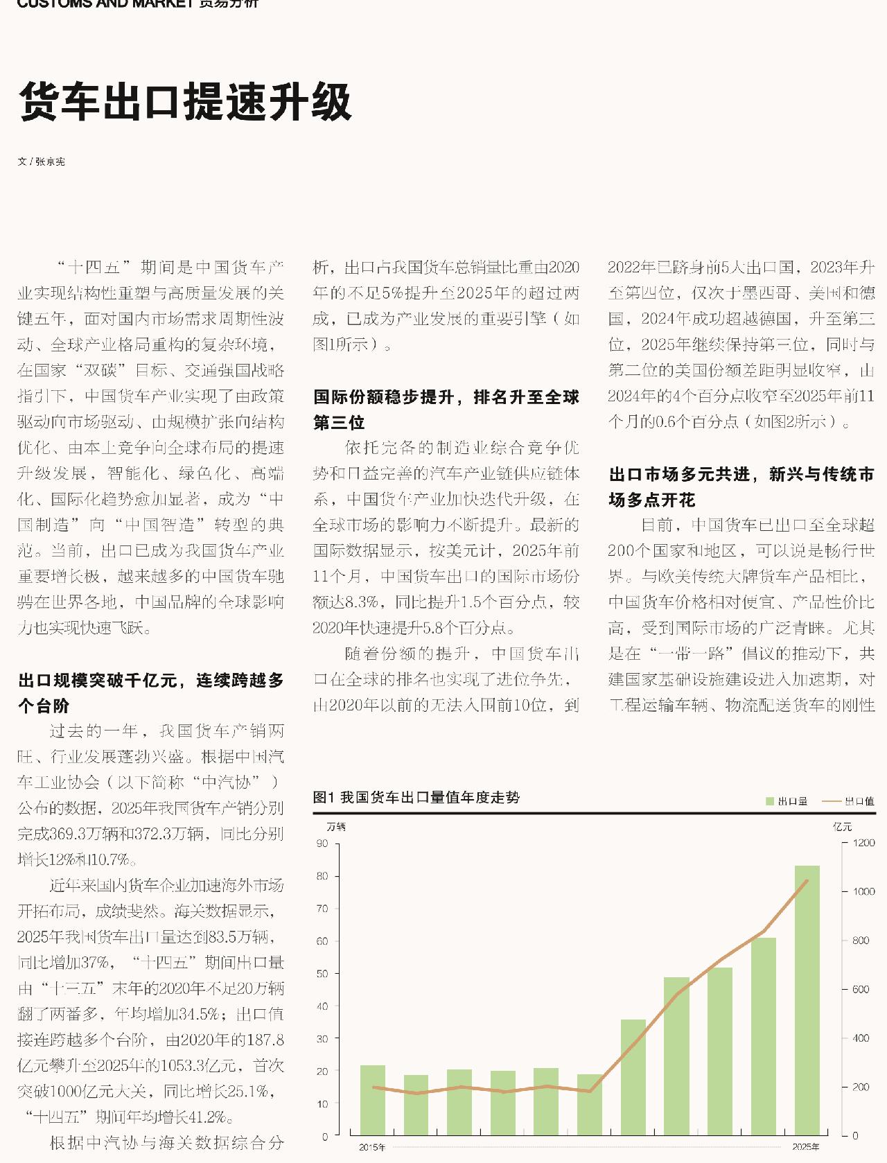 近年来国内货车企业加速海外市场开拓布局,成绩斐然。海关数据显示,2025年我国货车出口量达到83.5万辆,同比增加37%,“十四五”期间出口量由“十三五”末年的2020年不足20万辆翻了两番多,年均增加34.5%;出口值接连跨越多个台阶,由2020年的187.8亿元攀升至2025年的1053.3亿元,首次突破1000亿元大关,同比增长25.1%,“十四五”期间年均增长41.2%。