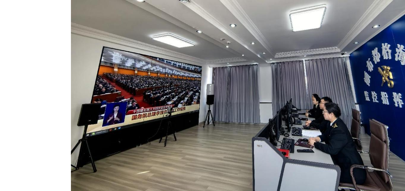 3月5日,满洲里海关所属额布都格海关在三级监控指挥中心集中观看十四届全国人大四次会议开幕会直播。图 / 花尔