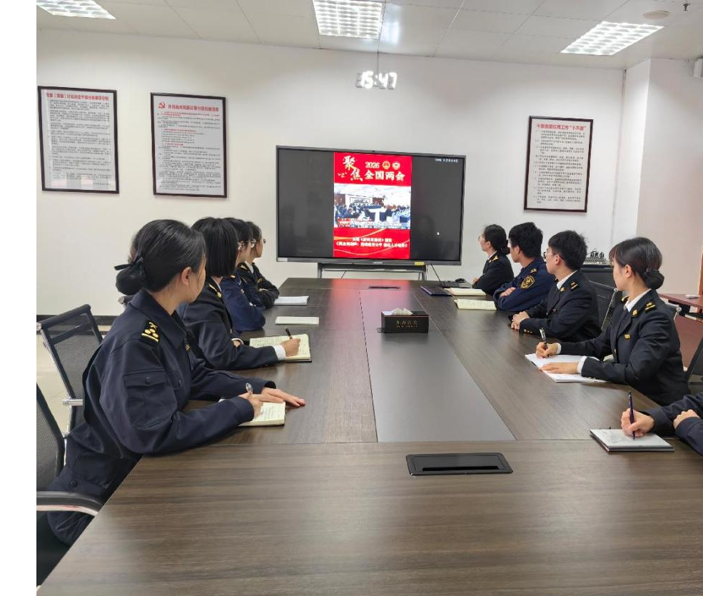 3月5日,江门海关组织青年干部观看“聚焦2026全国两会”视频报道。图 / 曾泽向