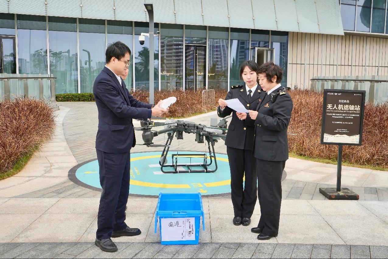 海口海关所属海口港海关免税品监管一科关员正在核查中免(海口)国际免税城无人机配送离岛免税商品。