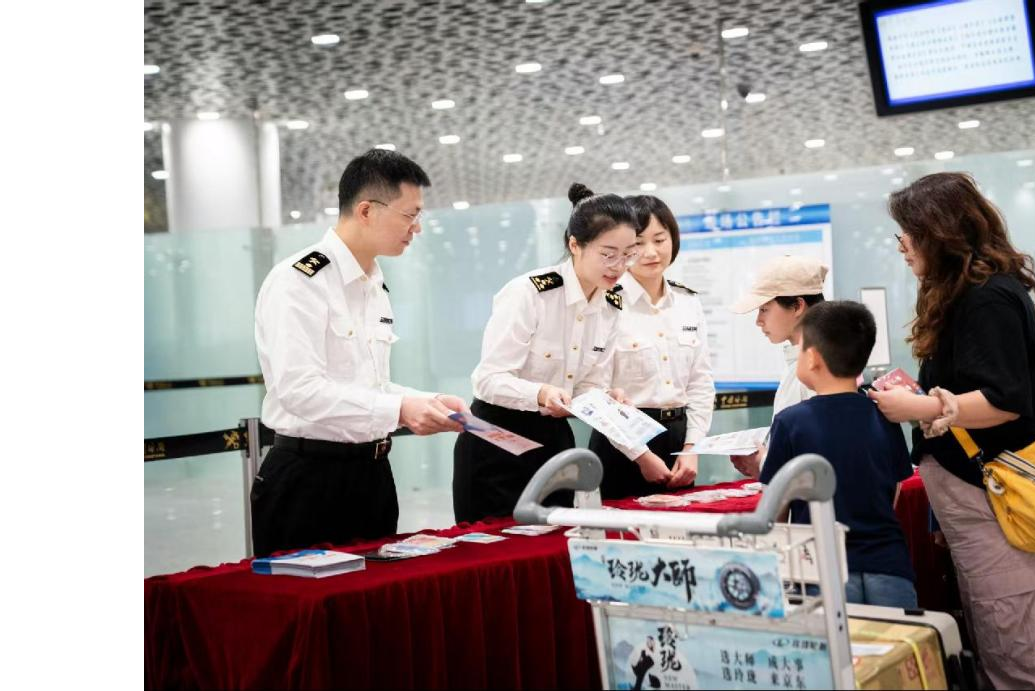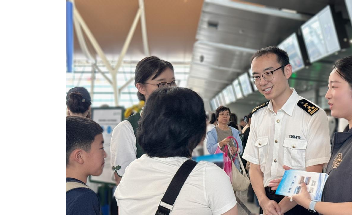 深圳海关所属深圳宝安机场海关关员在深圳机场口岸旅检大厅通过政策宣讲、互动问答、派发宣传资料等方式,向进境旅客普及出入境禁限携带物品、国门生物安全、打击走私等相关法律法规。图/叶俊超
