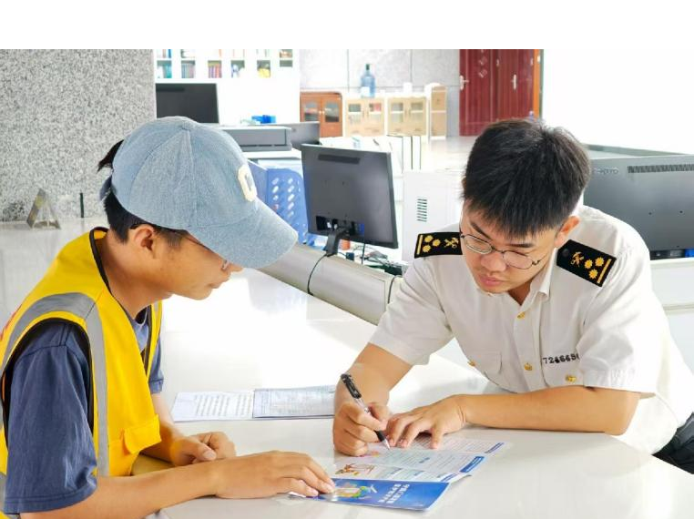 南宁海关所属峒中海关关员在报关大厅向办事人员进行普法宣传。图/何际豪