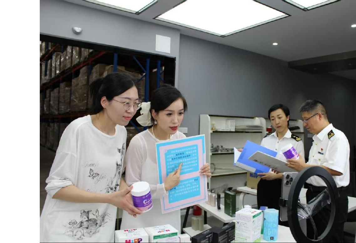 杭州海关所属钱江海关关员来到跨境电商进口商品保税仓库的直播间,开展“带货又带法”普法宣传活动。图/郑嘉懿