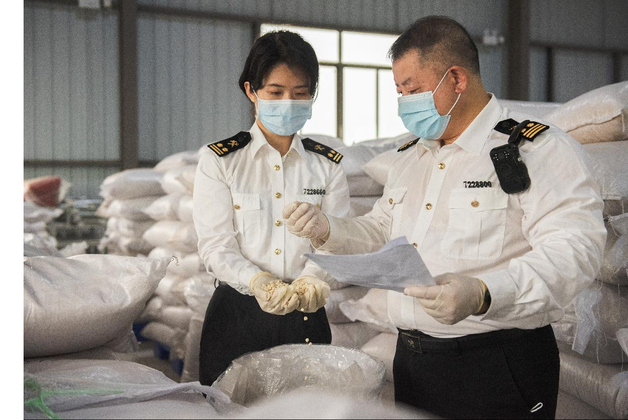 南宁海关所属邕州海关关员对即将出口的玉米种子开展现场监管。图 / 梁长璨
