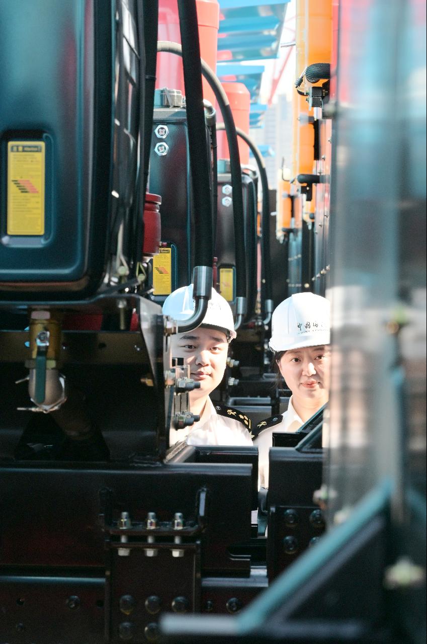 青岛海关所属青岛大港海关关员现场验放出口东盟的工程车辆。图 / 高瑞刚