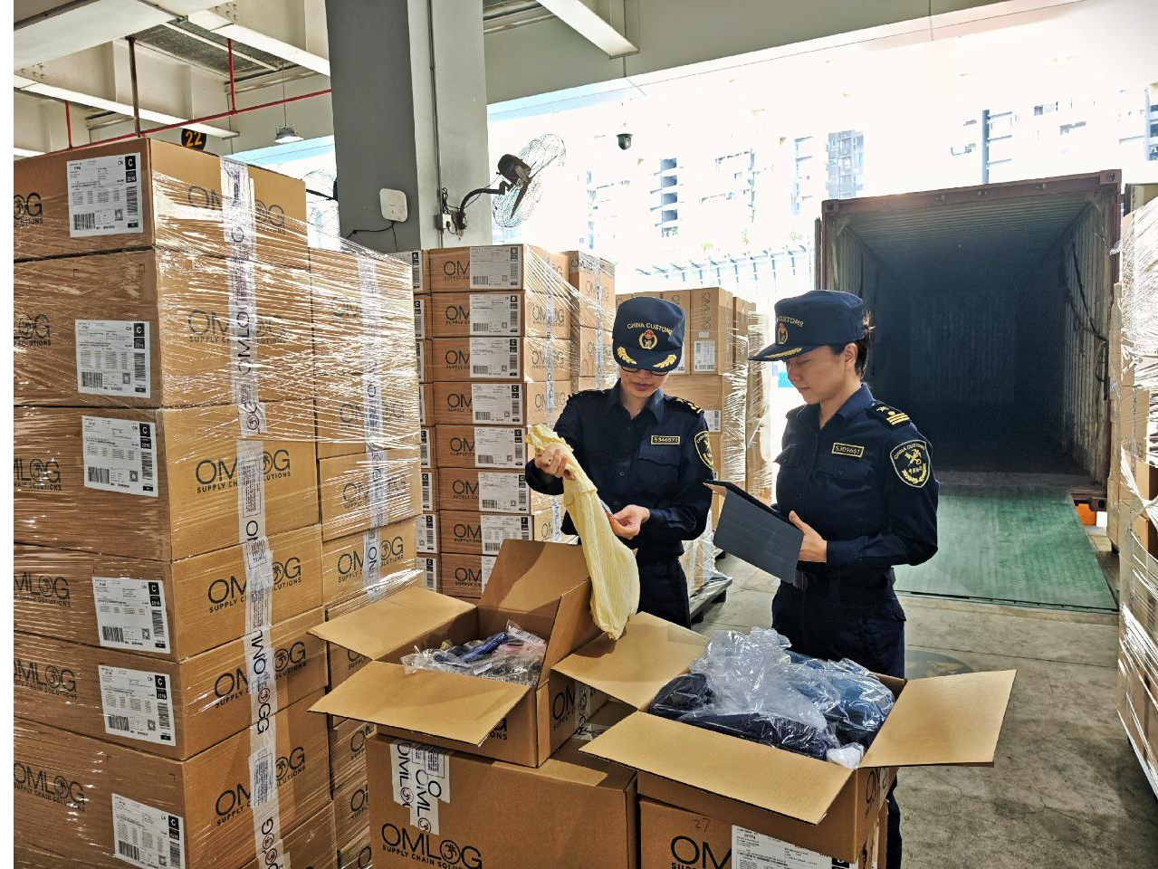 深圳海关所属莲塘海关关员正在对一批进口童装进行查验。图 / 郝泳深