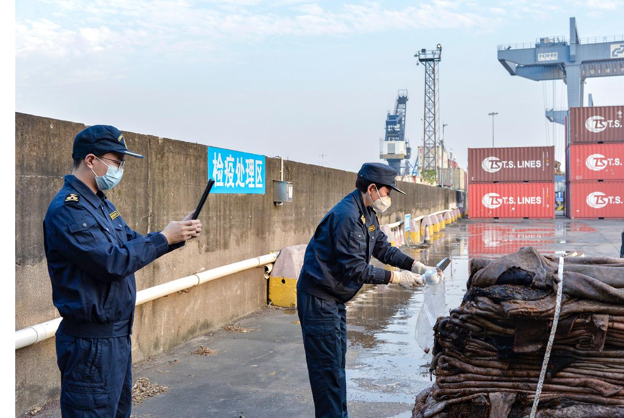 江门海关所属高沙海关关员监管进口盐湿牛皮。图 / 李保华