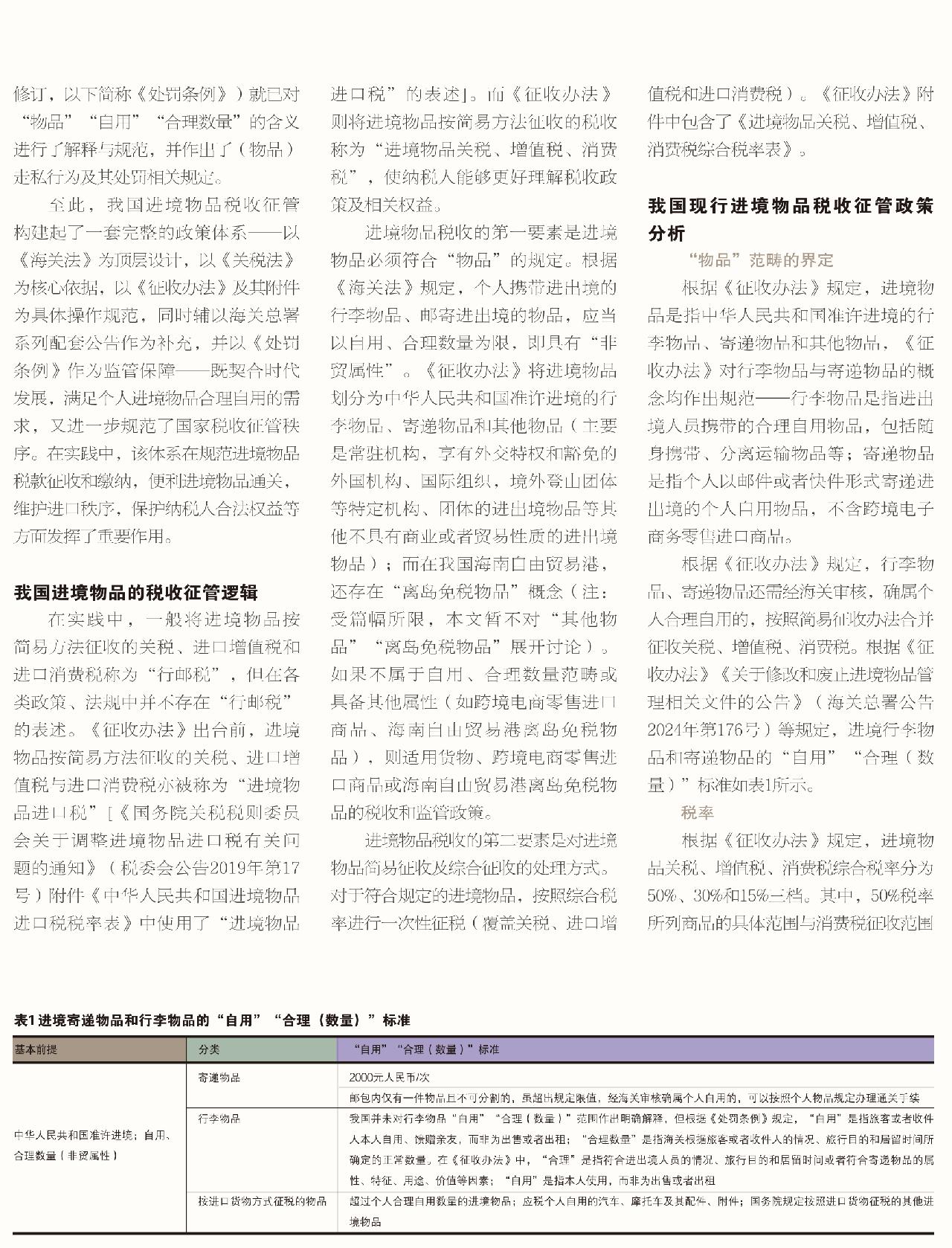 根据《征收办法》规定,行李物品、寄递物品还需经海关审核,确属个人合理自用的,按照简易征收办法合并征收关税、增值税、消费税。根据《征收办法》《关于修改和废止进境物品管理相关文件的公告》(海关总署公告2024年第176号)等规定,进境行李物品和寄递物品的“自用”“合理(数量)”标准如表1所示。