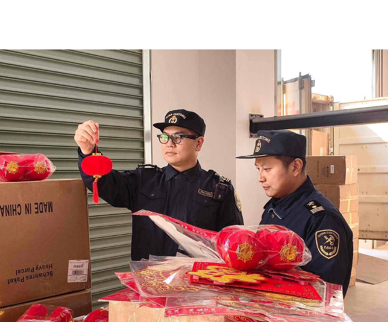2月4日,杭州海关所属义乌海关关员在义乌国际枢纽港使用AI眼镜对出口灯笼商品进行查验,保障春节前的节日用品等货物顺利通关。自开港以来,截至2月4日义乌国际枢纽港海关监管转关货物货值已达89.25亿元。图 / 吕非凡