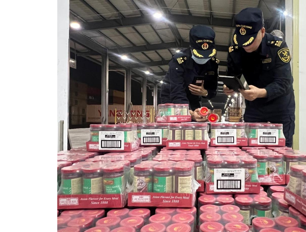 1月30日,江门海关所属外海海关关员加急验放辖区“经认证的经营者”(AEO)企业出口的调味品。该关积极发挥“保通保畅党员先锋队”作用,引导企业采用“先查验后装运”等模式,联合场所经营方提供个性化预约监管方案和配套吊装调拨服务。截至2月5日,该关今年预约监管进出口货物3.5亿吨,货值10亿元。图 / 陈琳